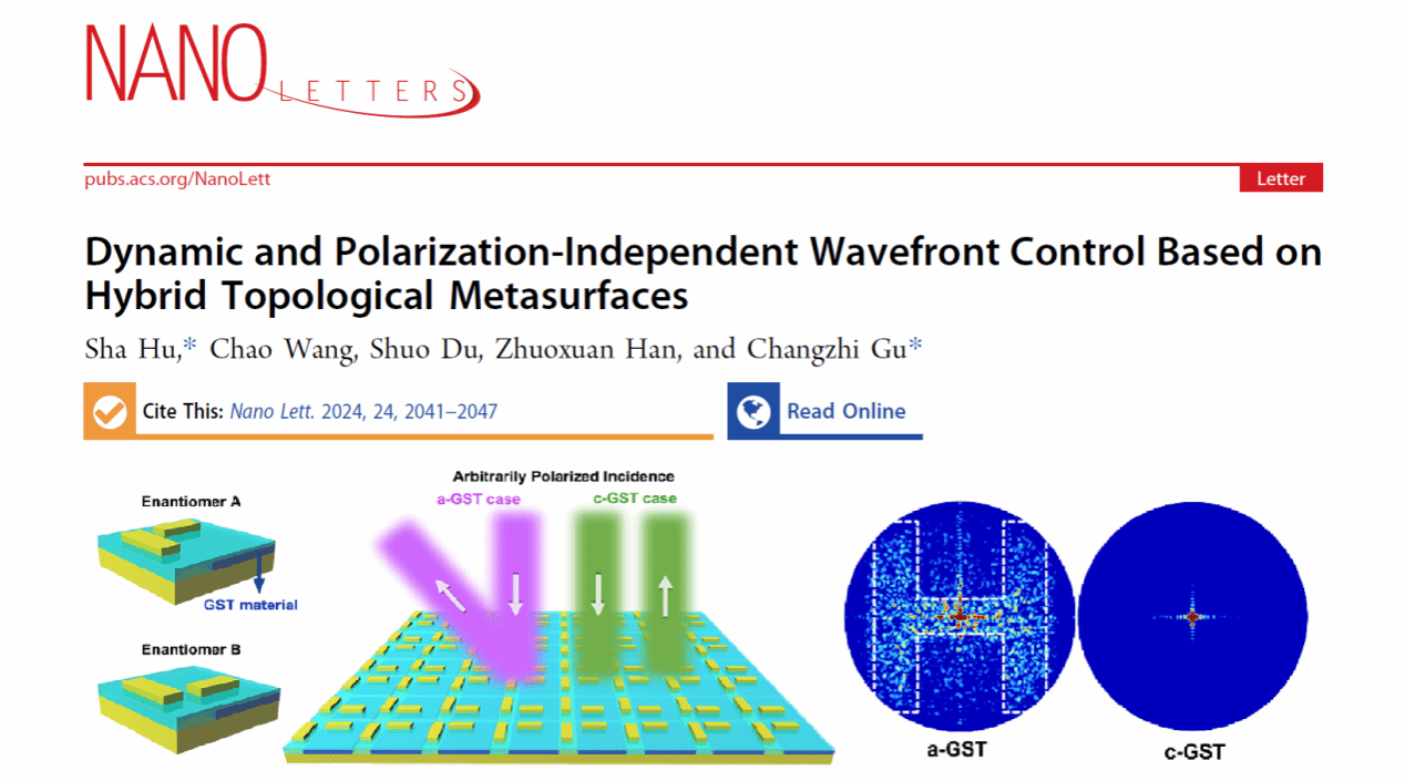 青年教师胡莎博士在纳米科技领域国际顶级期刊《Nano Letters》(中科院一区TOP,IF = 10.8)上发表了题为“Dynamic and Polarization-Independent Wavefront Control Based on Hybrid Topological Metasurfaces”(DOI: 10.1021/acs.nanolett.3c04621)的研究型论文。胡莎博士为论文的第一作者和第一通讯作者,中科院物理所顾长志研究员为共同通讯作者,91短视频