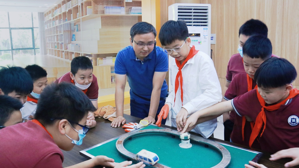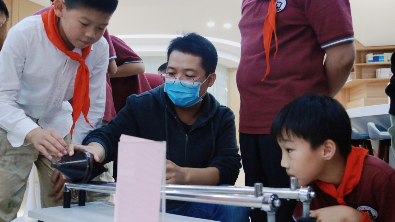 的杨武老师和孔腾飞老师耐心地为学生们讲解科学知识,面对一台台有趣的科普仪器,孩子们充满了好奇心,专心听讲,还积极参与体验。超导磁悬浮列车演示、高压静电演示、锥体爬坡……一系列的体验项目,让学生们大开眼界。大家在“看一看”“试一试”“想一想”中感受到了科学带来的快乐,通过动手操作与亲身体验让同学们感受到了科技的魅力和神奇。整个活动集知识性、趣味性、互动性为一体,让学生通过参与游戏互动的方式,学习科学知识,感受科学魅力。