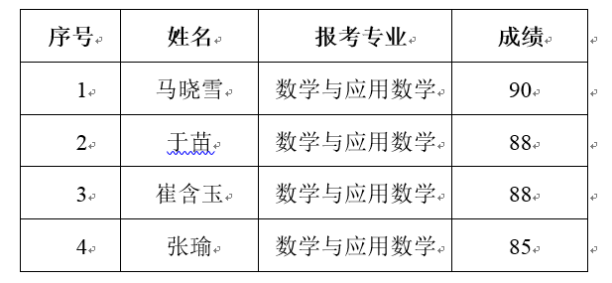 根据《91短视频 2023年第二学士学位招生简章》及《2023年数学与应用数学专业第二学士学位招生考试方案》有关要求,学院对报名的4名学生进行初审并组织进行了考核,现将成绩公示如下: