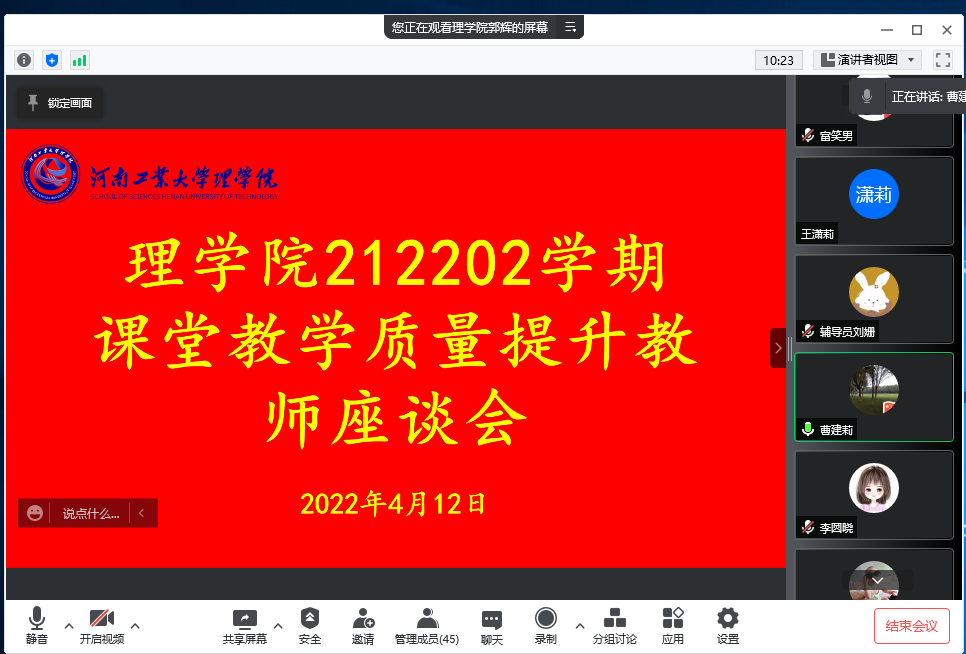 3月22日,学院邀请学校督导黄亮、学院督导、学科负责人召开线上“课堂教学质量提升教学督导交流会”,各督导针对青年教师培养、教师梯队建设、教学竞赛推优、基层教学组织建设和课堂教学质量提升等方面提出了建设性的意见和建议。